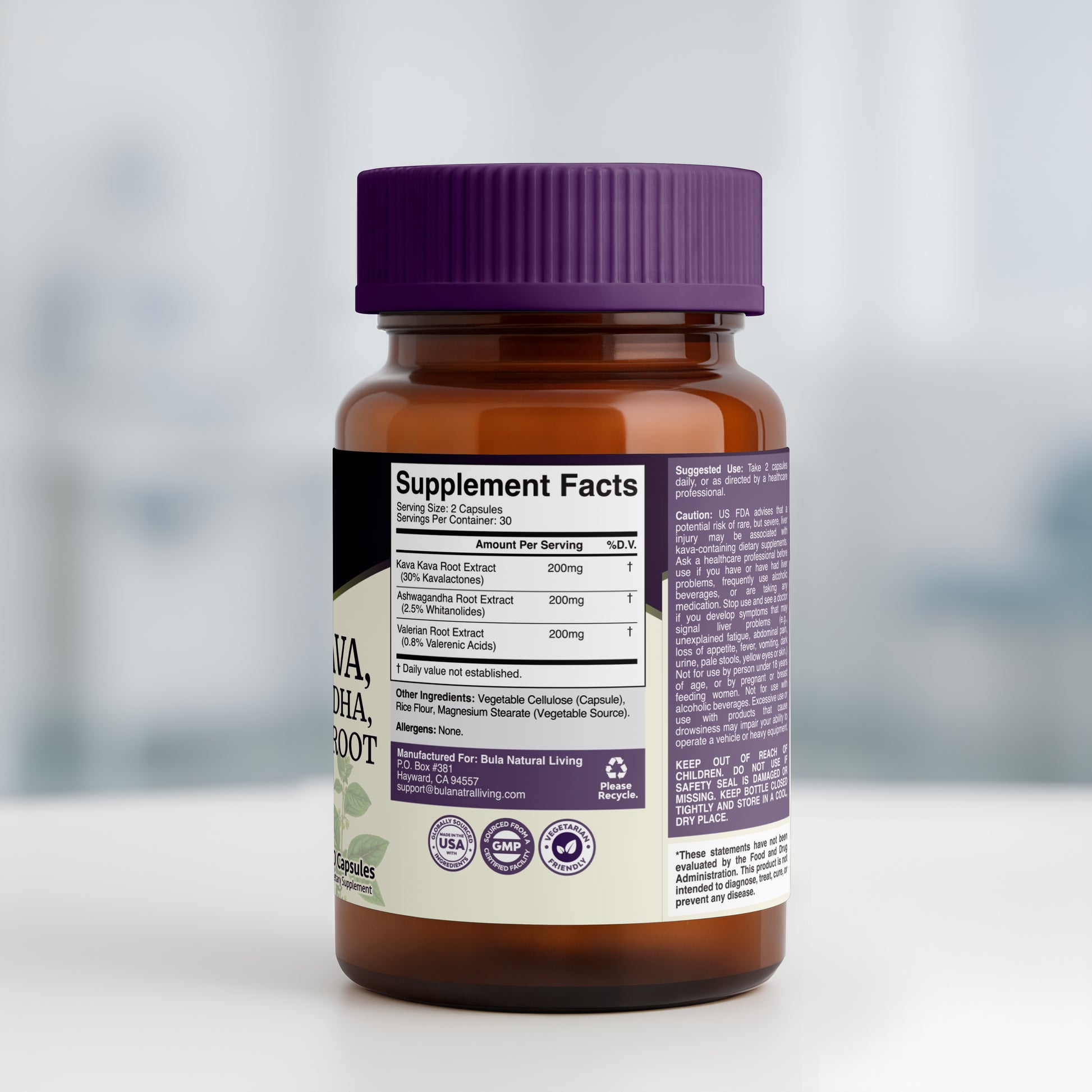 Bula Natural Living Kava Kava, Ashwagandha & Valerian Root Pills – 60 Pills (30 Servings)